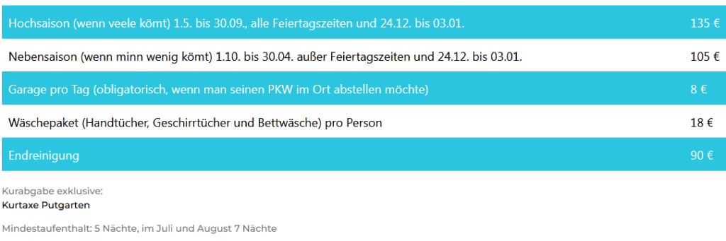 • Hochsaison (wenn veele kömt) 1.5. bis 30.09., alle Feiertagszeiten und 24.12. bis 03.01. 135 €